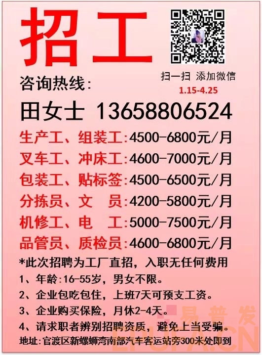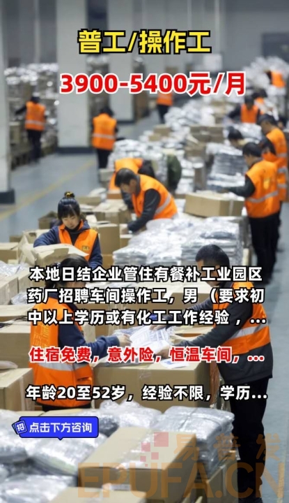 招聘车间操作员若干人 男女不限 18-45周岁 综合薪资4000-4800元/月 管住 宿...