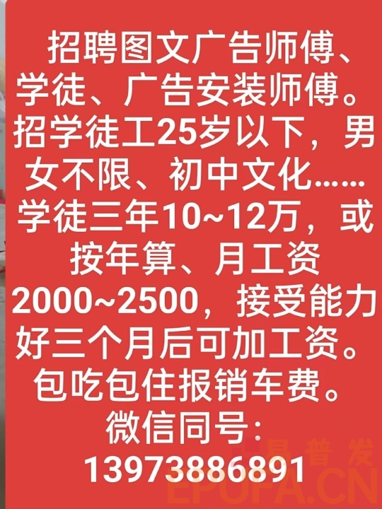 招聘图文广告师傅、学徒