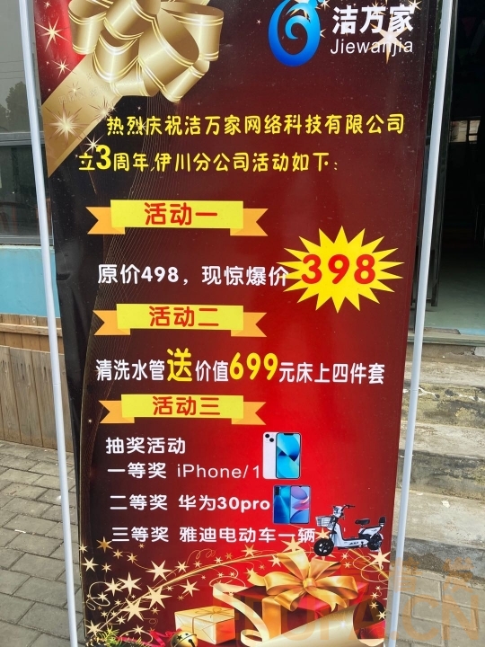 10月26号——11月26号上门清洗自来水管原价498元现价398元,送精品礼物一份,11月26号晚上到本店有抽奖活动,一等奖苹果手机一部,二等奖华为手机一部,三等奖电动车一辆