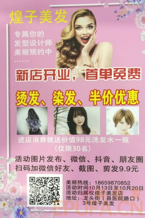 煌子美发沙龙店10月13日盛大开业,专属你的发型设计师以诚挚的服务,以专业的技术为你量身定制,劲爆活动来袭: 1⃣ 新店开业、首单免费 2⃣ 拉直、烫发、染发5折优惠 3⃣ 充值活动:充值500元送150元 充值1000元送350元 充3000元送1200元 4⃣ 加微信好友、转发店铺活动文案、转发朋友圈集赞38个免费领取价值98元的洗发水(仅限30名) 地址:东兰县龙头街(县医院路口)煌子美发店