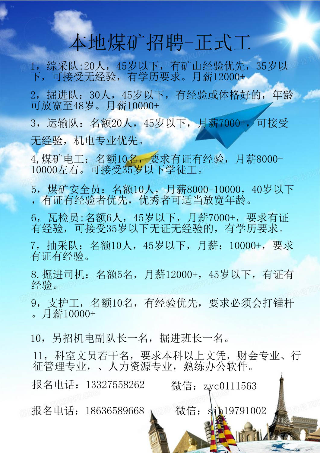 5,煤矿安全员:名额10人,月薪8000-10000,40岁以下,有证有经验者优先,优秀者可适当放宽年龄。