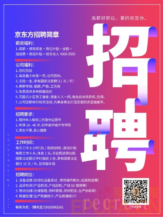 高薪好职位,要的就是你。京东方招聘简章薪资福利1、底薪+绩效奖金+岗位补贴...